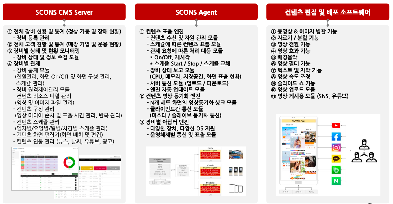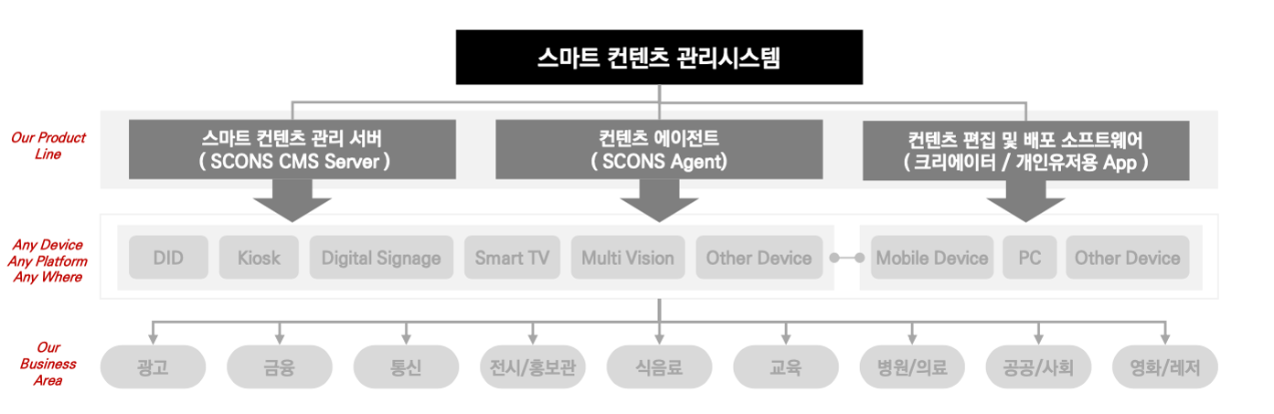 키오스크, 디지털사이니지, DID, 멀티비전과 같은 다양한 디스플레이와 Web, Mobile 등의 사용자 환경에 표출되는 영상 등의 컨텐츠 서비스들을 위한 전문 개발 툴